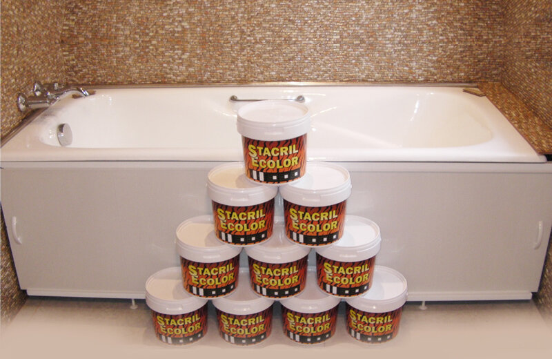 Хороший результат дает нанесение акриловой пасты. После высыхания она образует прочное покрытие, которое прослужит до 10 лет при соблюдении правил эксплуатации. Акрил со временем не желтеет, но пятна на нем могут появиться. Это случается при попадании красителей, агрессивных химических средств. Остаются следы от абразивных моющих средств, сильных ударов острыми предметами. От этого отреставрированную поверхность нужно оберегать.