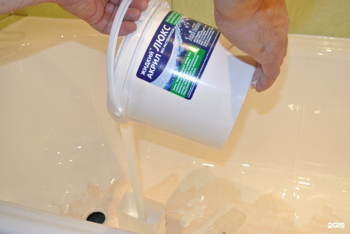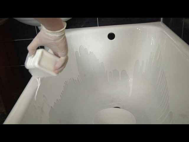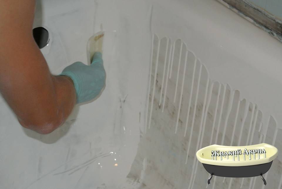 Специальный состав наносится на очищенную, обезжиренную и зачищенную шлифовальной бумагой поверхность ванны путем равномерного наливания состава на борта ванны. Под действием собственного веса смола стекает по стенкам на дно и образует довольно толстое и прочное покрытие, обладающее превосходным блеском акрила и прочностью металлической ванны. Обновление старой ванны таким способом дает приемлемые результаты при отсутствии больших повреждений основного покрытия.