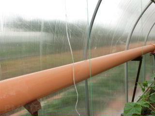 - К пластиковому баку подсоединяется шланг либо пластиковая труба и прокладывается по центральной части парника. Шланг должен быть расположен в горизонтальном положении.