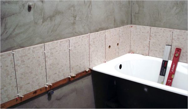 При облицовке от борта ванна должна уже стоять на готовом напольном покрытии.