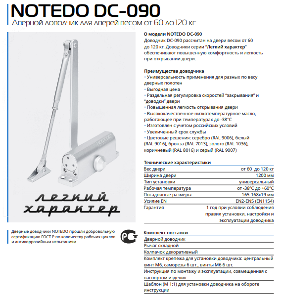 Показатель обозначается маркировкой EN1 и до EN7. Чем выше цифра маркировки, тем больший вес полотна допустим. - Наличие возможности фиксации двери в открытом положении. Если эта функция присутствует, срабатывает фиксация после утяжки специального фиксатора. Снимается положение двери, если потянуть ее на себя.
