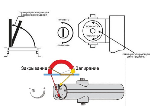 При необходимости элементарного плавного закрывания тяга слегка уменьшается в длине и устанавливается перпендикулярно двери. При наличии в створке защелкивающегося механизма требуется солидарное усиление для преодоления его сопротивления. В этом случае тяга удлиняется и фиксируется в перпендикулярном относительно двери положении.