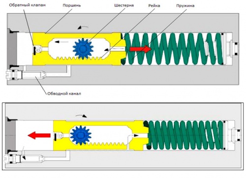 Посредством зубчатой шестерни и рейки приводится в движение поршень, который и оказывает воздействие на пружину. По внутренним проточкам в поршне масло перетекает в освобождающуюся часть корпуса. Ограничение скорости закрытия происходит за счет регулировки скорости движения масла по каналам для обратного перетекания.