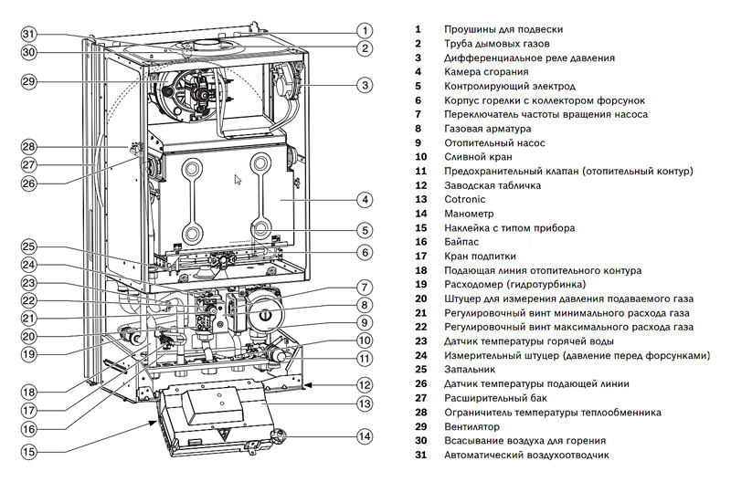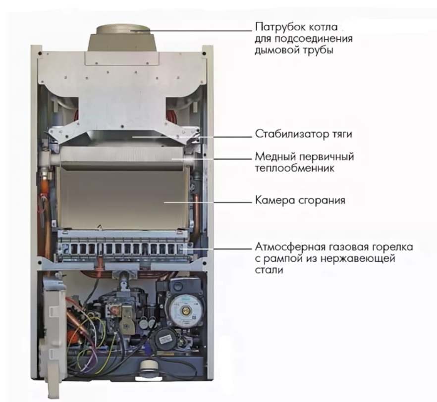 Схема устройства двухконтурного котла с модуляционной горелкой и принудительной тягой