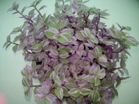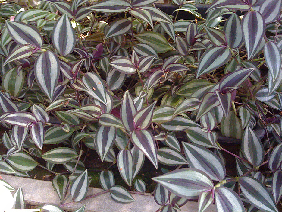 Традесканция Зебрина или висячая. Эффектное растение со свисающими голыми стеблями часто красноватого оттенка. Верхняя глянцевая поверхность листа с продольными серебристыми полосками на темно-зеленом фоне. С нижней стороны листовая пластина фиолетово-лиловая.