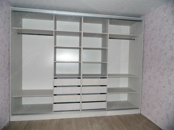 Наполнение шкафа 2,3 до 2,7 метра можно разделить на три секции, причем, дверей будет не три, а четыре. В шкафу от 3 метров и более секций будет четыре. Полок в таких больших шкафах будет множество, в нижней части для усиления жесткости конструкции могут быть добавлены выдвижные ящики и многоуровневые сетчатые корзины.