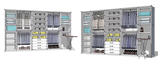 Вариантов планировки много, но вначале необходимо определиться, в каком помещении будет эксплуатироваться шкаф-купе. В разных помещениях варианты расположения внутренностей шкафов будет различным.