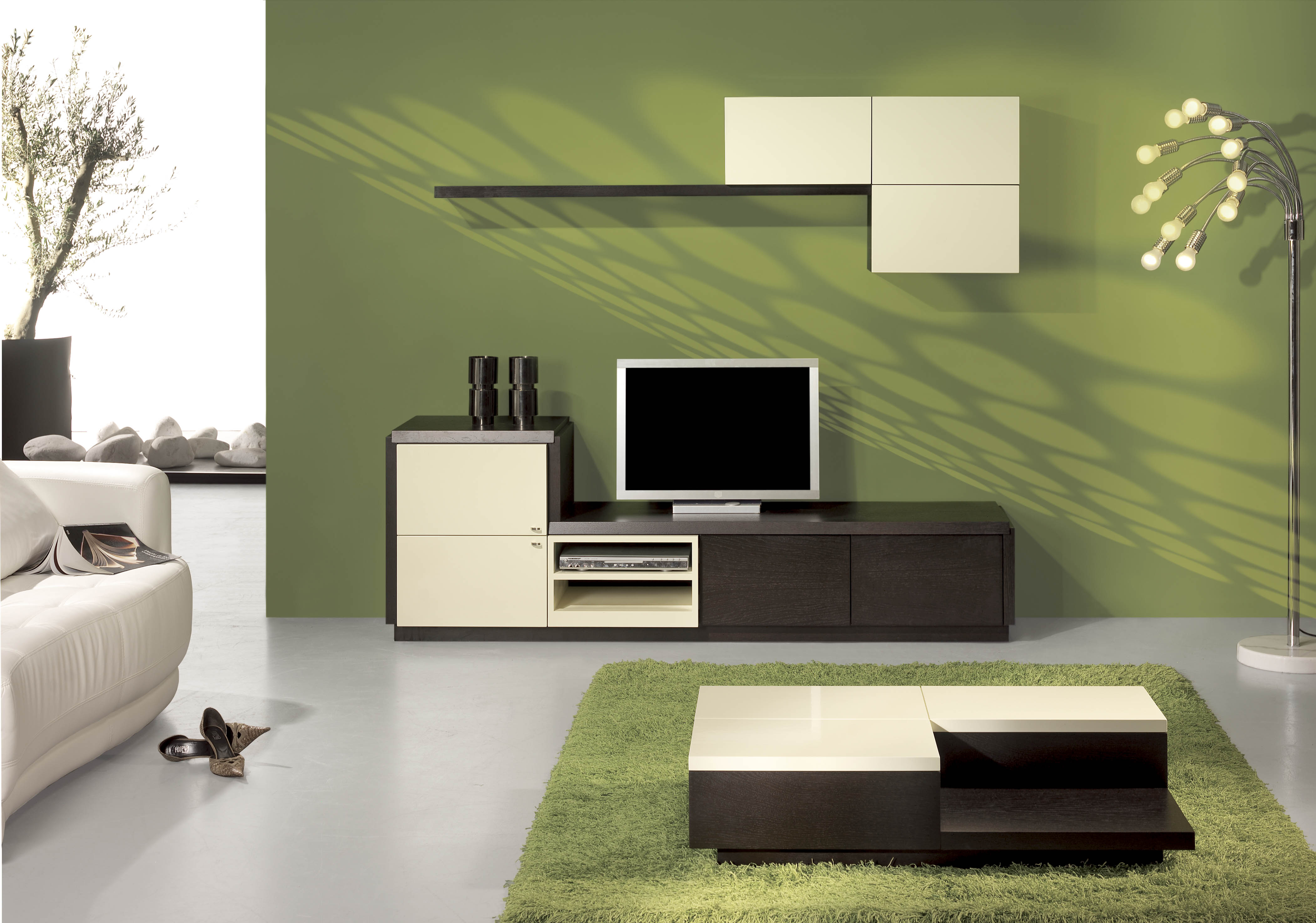 Шоколадно-коричневый, травянисто-зеленый и снежно-белый создают заманчивую цветовую комбинацию и делают эту гостиную омолаживающим убежищем.