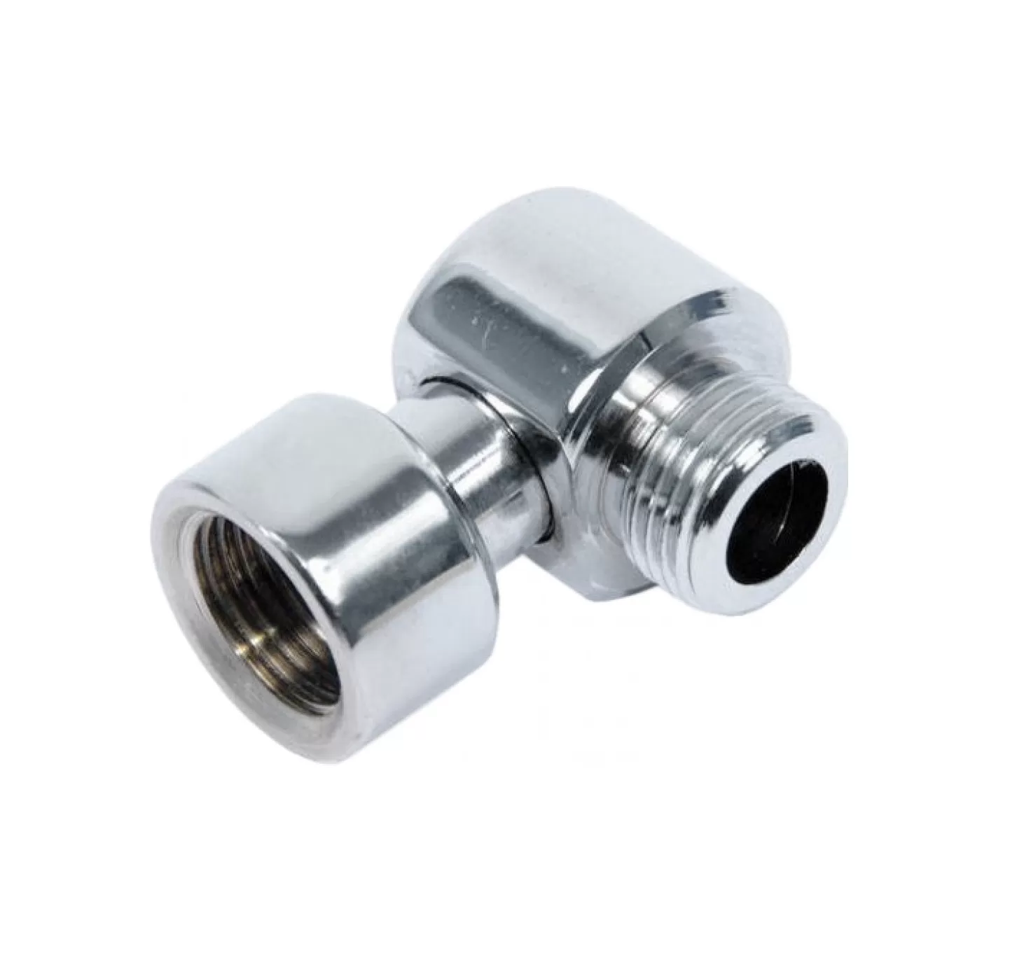 Гайка бывает круглой как на фото выше, или обычной, но очень тонкой. См. фото ниже. Такой гайкой затянуть должным образом льняной уплотнитель, не представляется возможным. Через короткий отрезок времени, это соединение начинает подтекать. Раскрутить и перемотать такую гайку тоже нереально, она ломается или гнётся, после чего всё равно ломается. Вот пример демонтажа такого соединения, спилено болгаркой: Второе соединение которое обычно бывает в комплектах: Собирается оно следующим образом. Для примера я взял два дюймовых уголка, но вы представьте что справа у нас труба подводящая, а слева полотенцесушитель: Резьба подводящей трубы уплотняется, и соединитель закручивается по часовой стрелке.