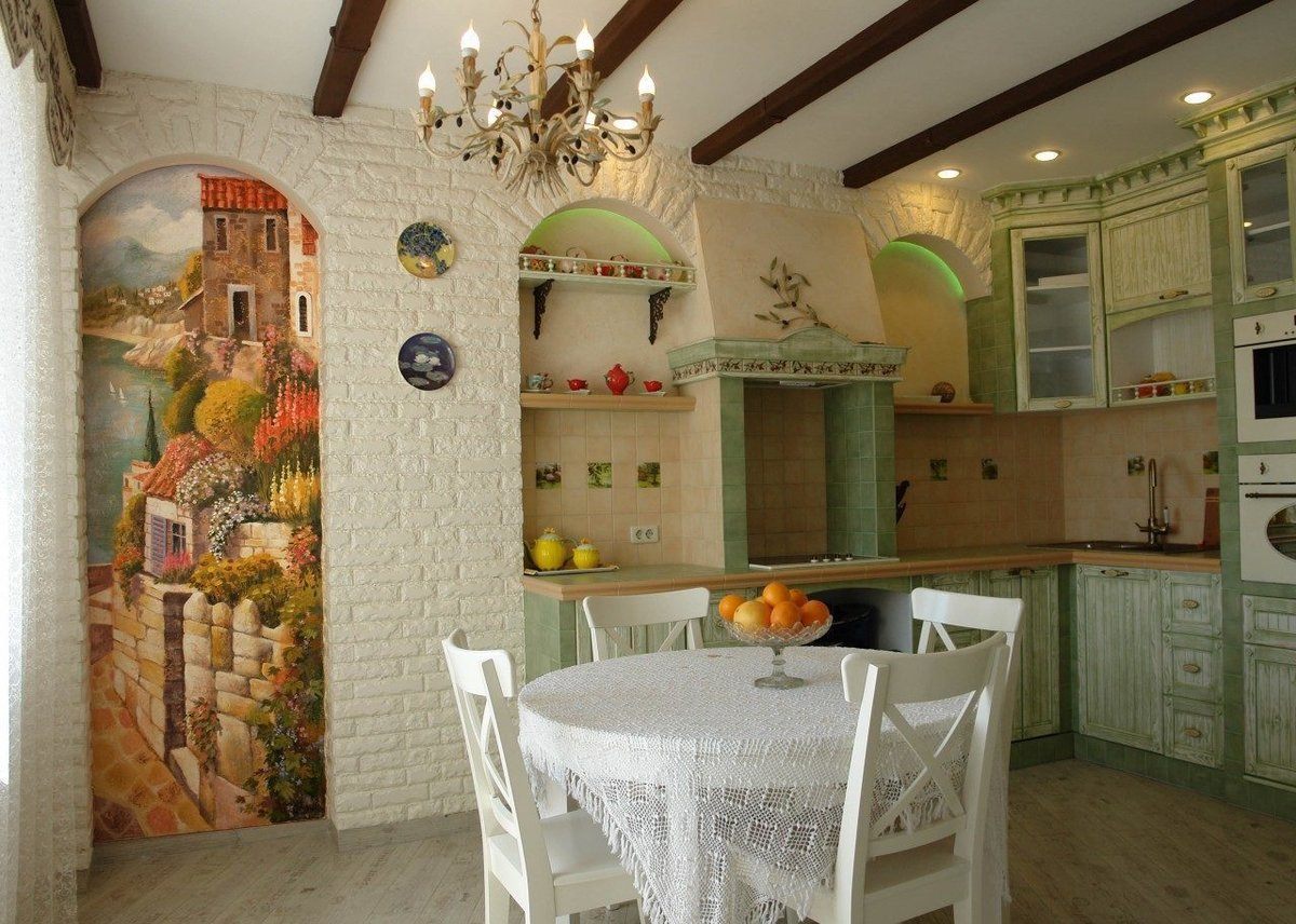 Чтобы кухня в стиле прованс была оформлена правильно, следует помнить, что в ней используется штукатурка, которую наносят не очень аккуратно, приветствуются ошибки и неровности.Если вдруг по каким-то причинам не пришел отделочный материал, его заменяют на обои. Они должны быть грубыми, с небрежным рисунком или фактурой.