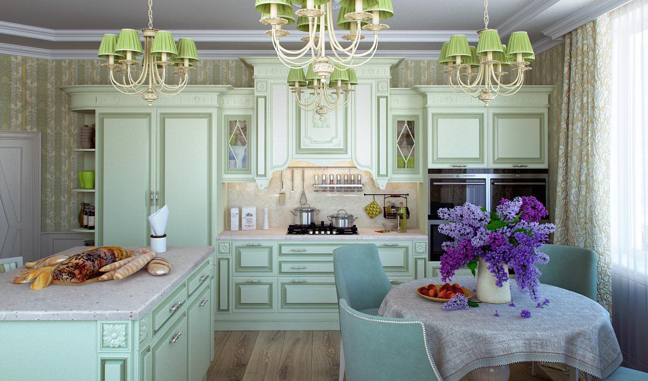 Пастельный и нежный фисташковый оттенок прекрасно смотрится на кухне в стиле французского кантри. Он хорошо сочетается с белым, голубым, розовым и цветом светлого дерева.