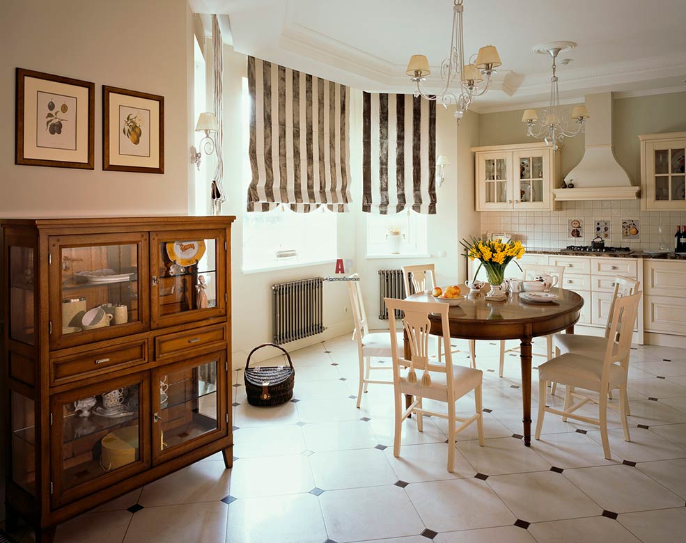 Если вы решили оформить комнату для приема пищи в подобном стиле, не забудьте об аксессуарах и украшениях.На нем должны висеть старинные часы, можно куранты; поставить на стол вазу, расписанную цветами — ромашками, декоративными подсолнухами, хризантемами; расставить подсвечники; полки с открытой посудой придают изящество и богатство; Позаботьтесь о декупажных рисунках.