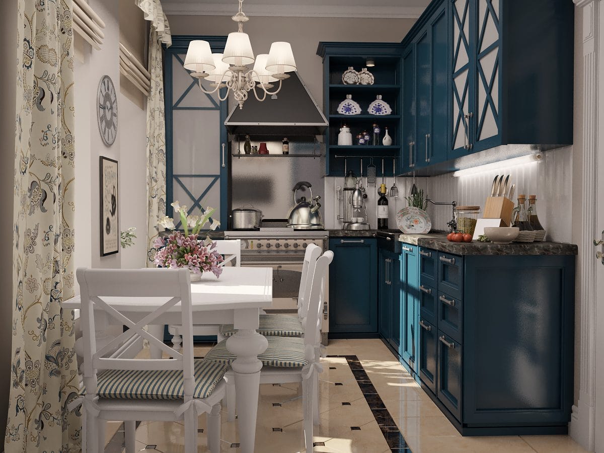 Кухня глубокого синего цвета будет гармонировать со светло-серыми и голубыми тонами.