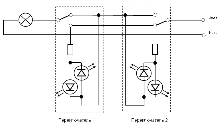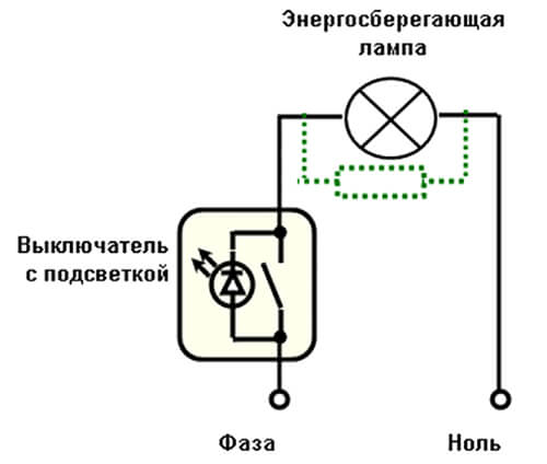 Этот конфликт выражен тем, что при выключенном выключателе лампа будет гореть или в случае с люминесцентными лампами мигать, поэтому нужно принять решение о том, нужен-ли Вам действительно выключатель с подсветкой или нет. Еще пару лет назад большинство электриков, об этой проблеме даже не знали.