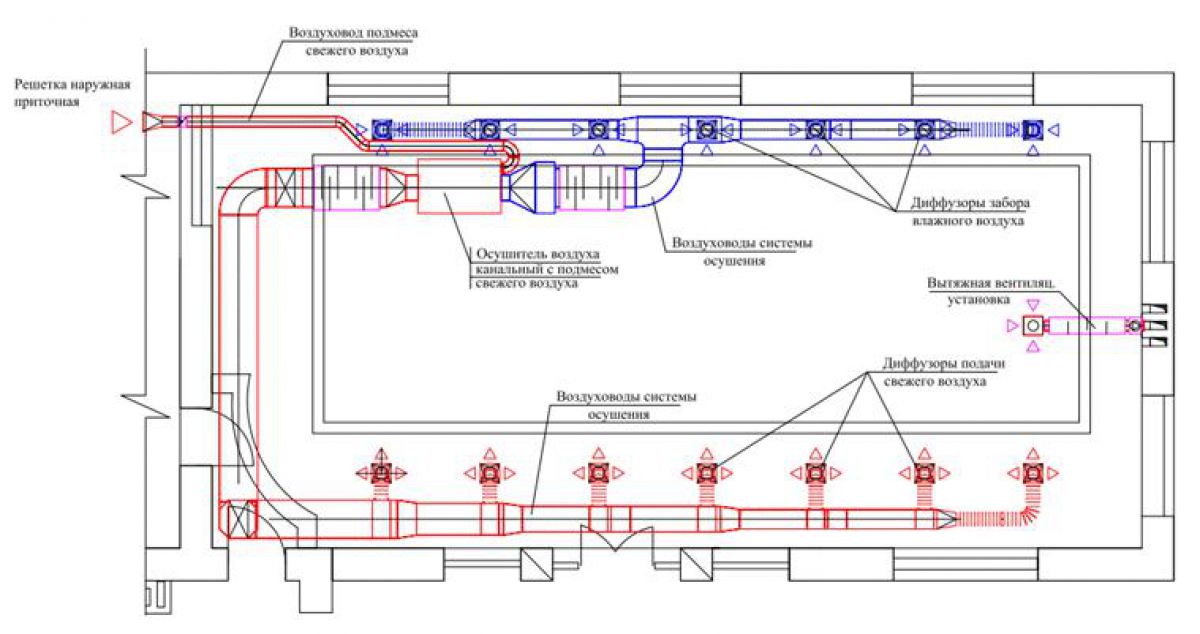 В этом случае вентиляция осуществляется в таком порядке: посредством приточного вентилятора воздух подается в канальный осушитель, смешивается с рециркуляционным, затем осушается и подается в помещение. Удаление воздуха происходит через вытяжной вентилятор из верхней зоны.