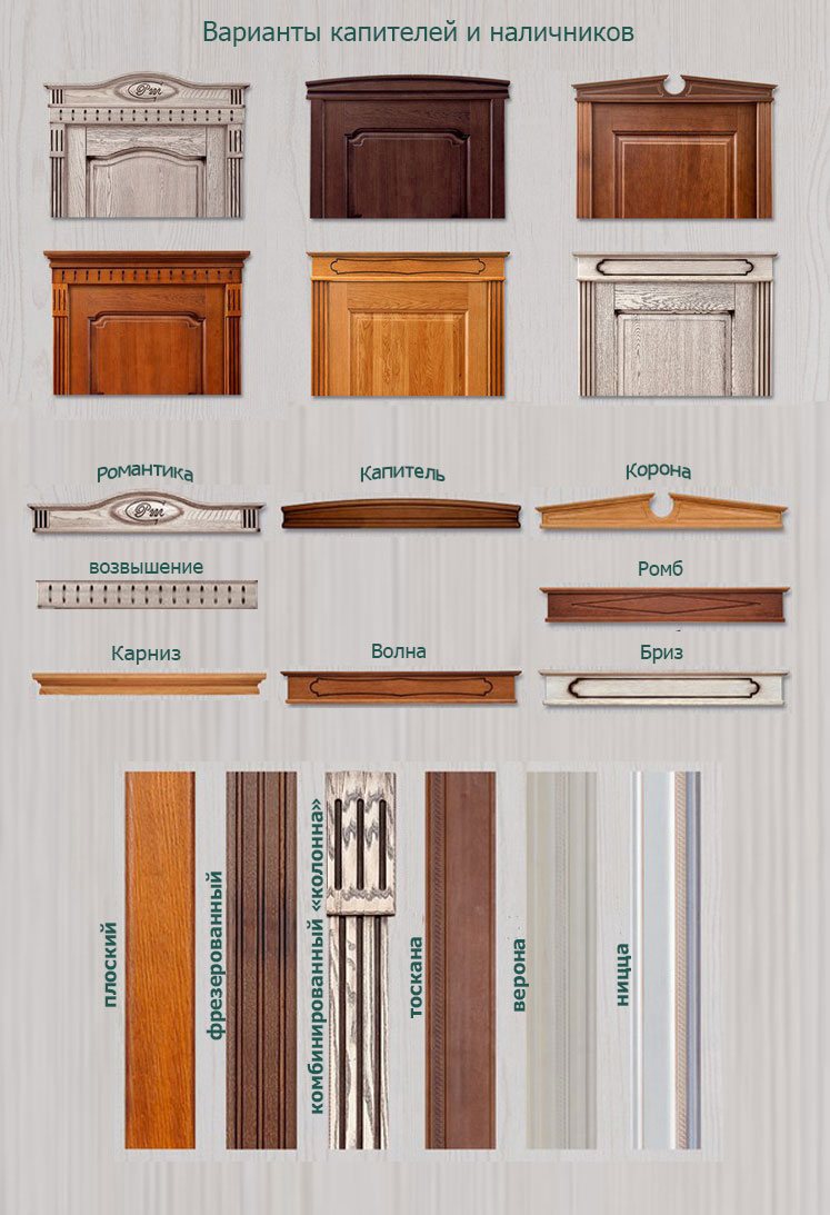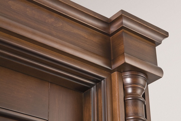 Капители — это отдельный самостоятельный комплект наличников, который предлагается чаще для дорогих дверей, и стоит он почти как дверное полотно. Капители чаще устанавливают только с парадной части помещения. Различают капители с карнизом и без карниза.