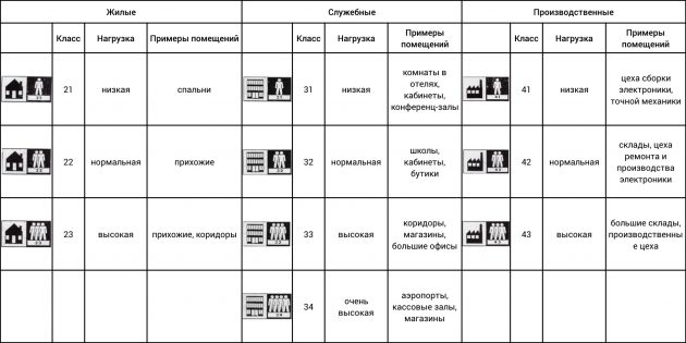 Внутри групп линолеумы дополнительно делятся на классы по интенсивности воздействия: