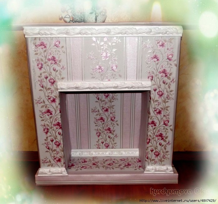 Пристенный практически готов, остаётся лишь украсить его. Внутрь можно установить фотографию настоящего пламени, а в топку сложить настоящие или самодельные дрова. Иногда люди устанавливают на полку подсвечники, это выглядит очень эффектно и придаёт ощущение старины.