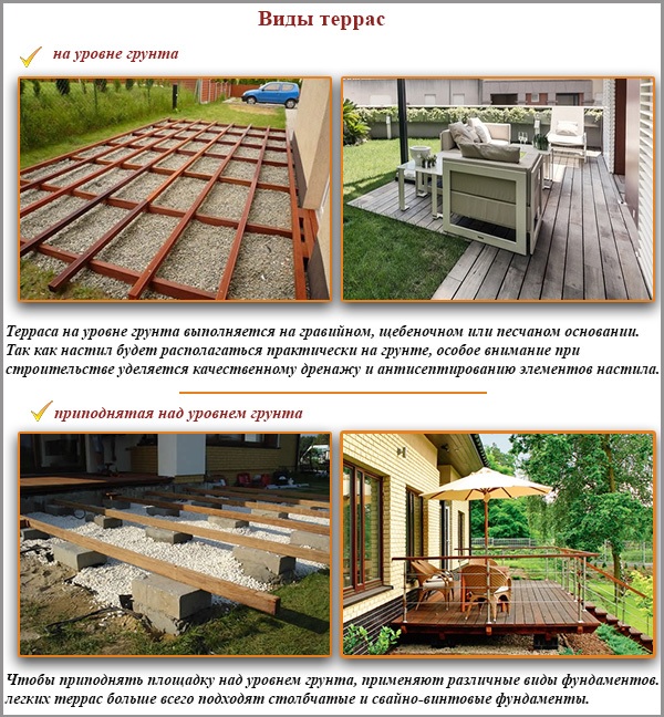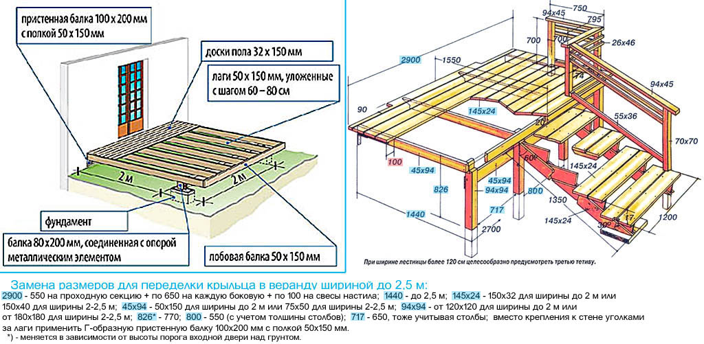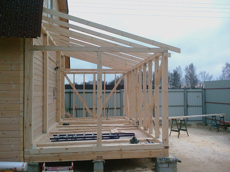 Основная функция веранды – защищать вход в основное здание от непогоды. Летом здесь отдыхают. Утеплять не нужно. Очень важна гидроизоляция фундамента. Строение может быть в виде обычного настила, с невысокими стенами и крышей, поднятой на столбах. Также строятся веранды, закрытые стенами, с дверью и одним или несколькими окнами.