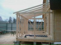 Для присоединения каркаса к основному зданию производится вертикальная разметка. Здесь необходимо соблюдать точность. После установки, чтобы сделать каркас крепче, его сразу оббивают.
