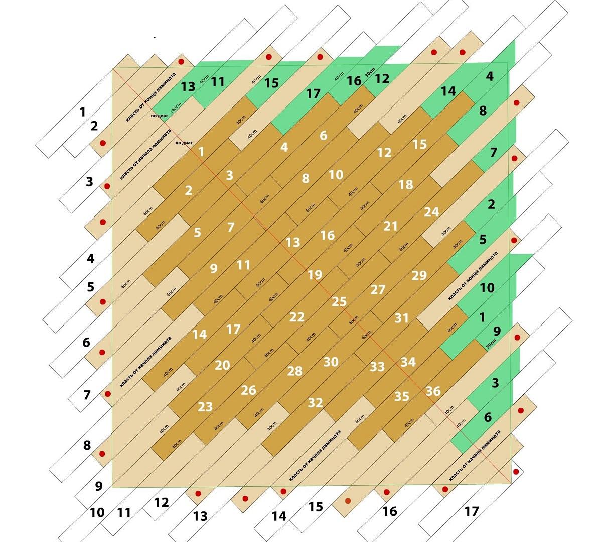 Пример расчета для комнаты 4х5 м с настилом ламината классическим способом: