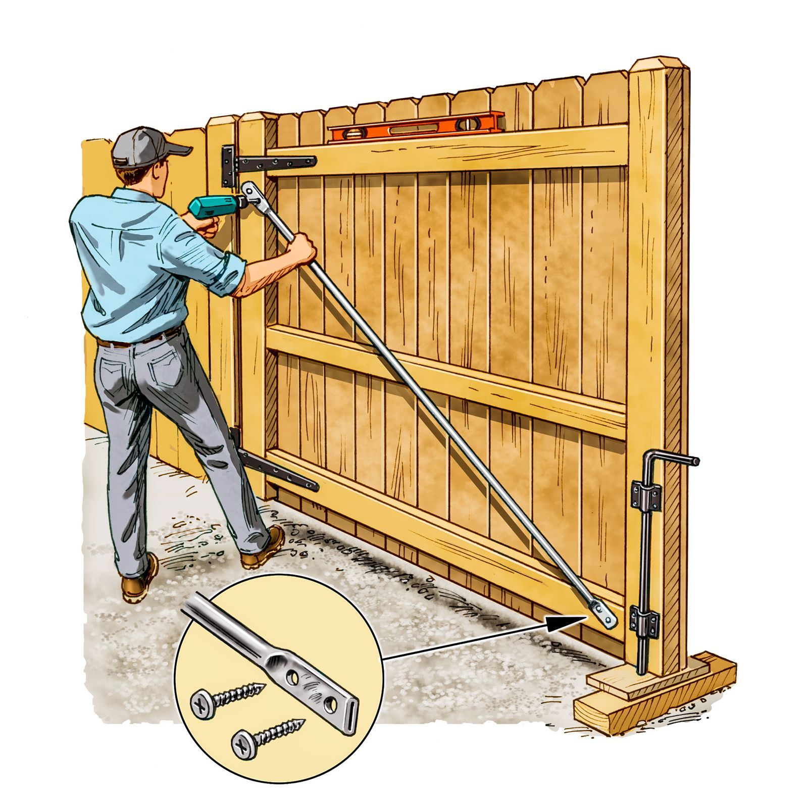 Теперь возьмите створки и можете посадить ворота на петли.